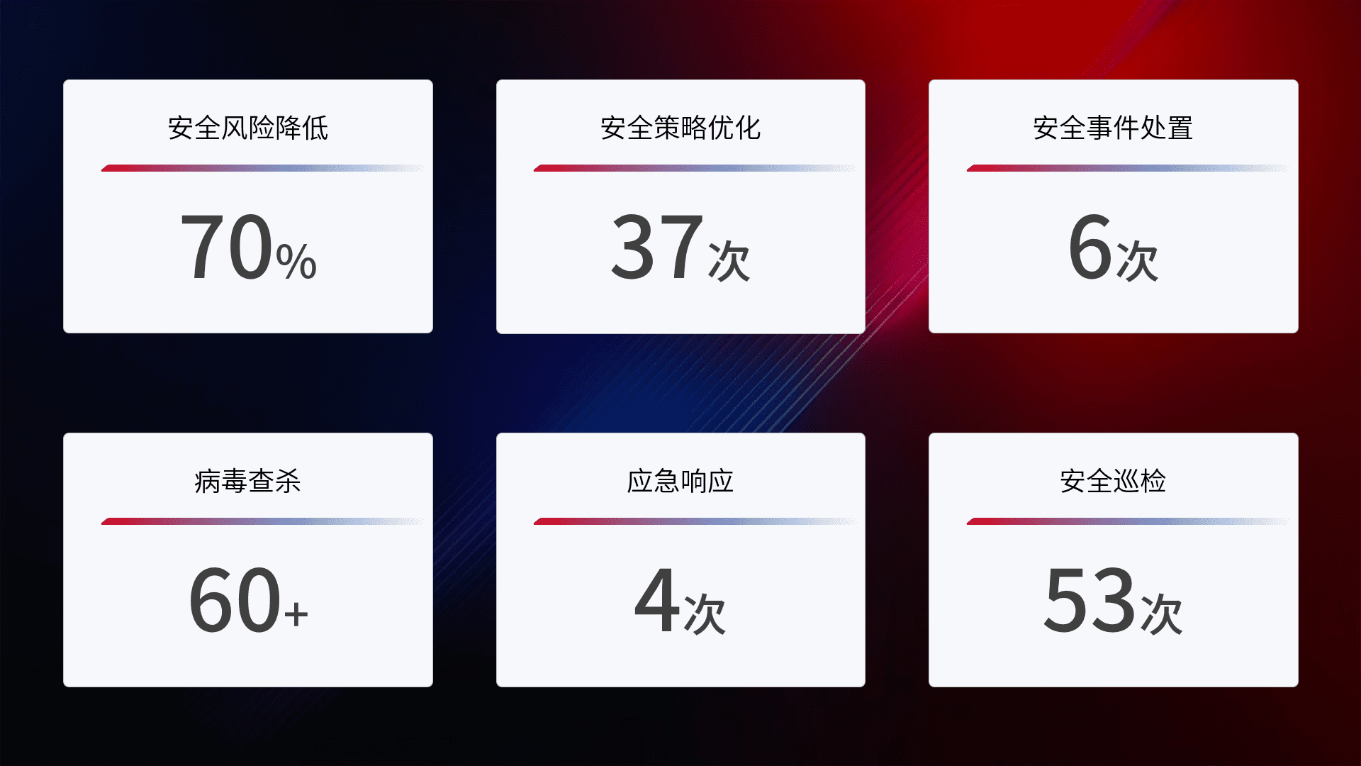 提供全面的安全事件报告体系,,包括处置报告、、、、周报、、季度和年度总结,,,结合持续监控,,,帮助客户深入了解网络安全状况。。
